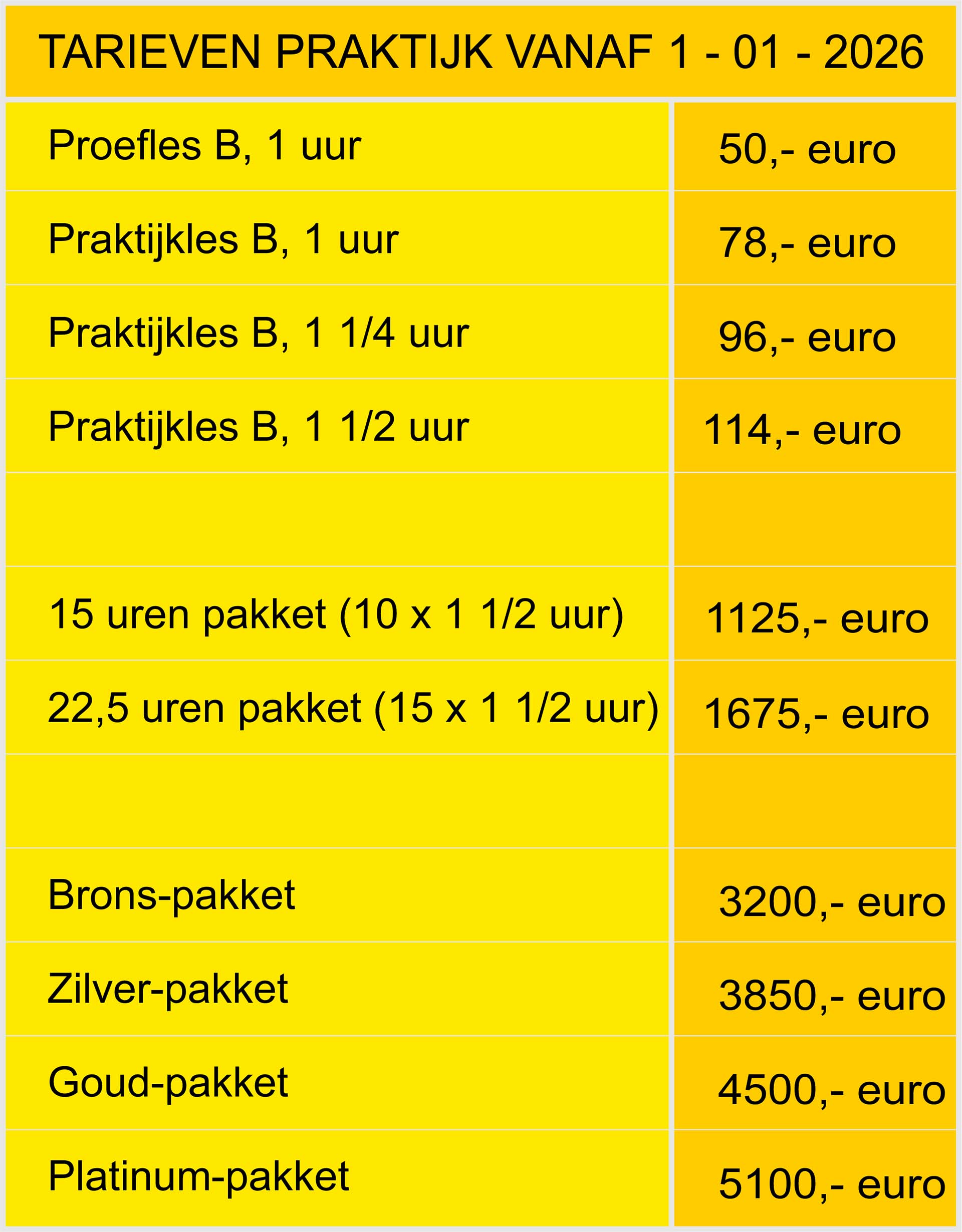 Alle prijzen van Praktijkexamens en Tussentijdse toetsen zijn inclusief 2 uur autohuur (dus heenrijden, plm. 3 kwartier les, examenrijtijd en terugrijden). Bij Faalangstexamens is deze totale rijtijd plm. 2 1/2 uur.